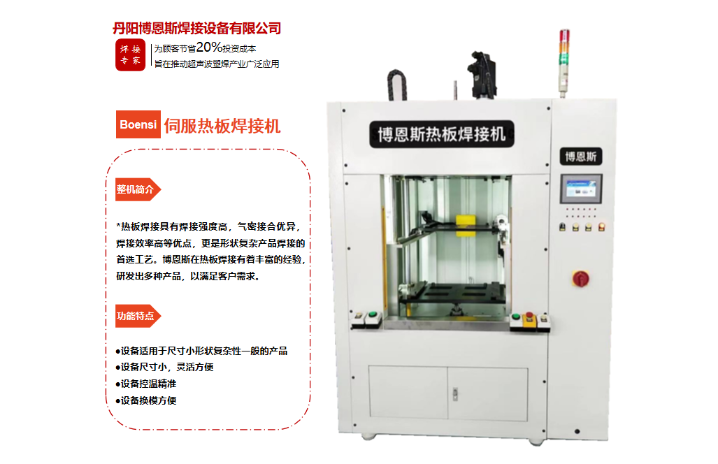 丹陽博恩斯焊接設備有限公司是塑料焊接領域集研發(fā)設計、生產制造、銷售服務為一體的企業。公司自成立以來堅持“以人為本”的理念,組織了一支強大的技術研發(fā)團隊,攜多年來積累的豐富經驗,并結合國際先進塑料焊接技術,根據市場需要,不斷開發(fā)具有核心競爭力的新產品。公司具有很強的非標機械研發(fā)、設計、生產能力,可為廣大客戶定制各類專用機械設備。公司設計生產的塑料焊接設備已廣泛應用于汽車、電子、家電、醫(yī)療器械、無紡布...